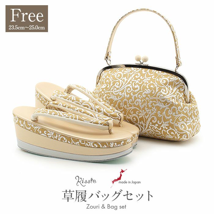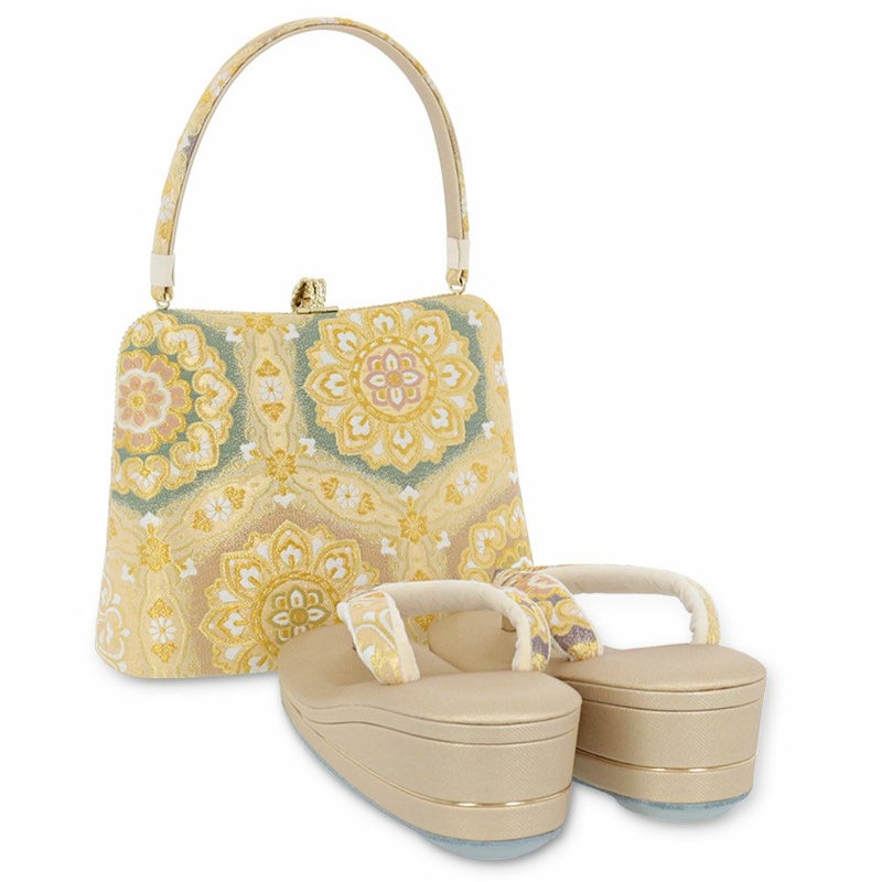 留袖用草履バッグセット 訪問着用 フリーサイズ Lサイズ 日本製 (かぶせタイプ)<シャンパンゴールド/流水に華紋>