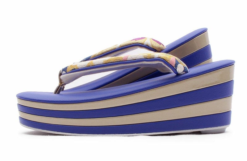 草履バッグセット 成人式 振袖用 <世美庵> Lサイズ フリーサイズ 日本製 正絹袋帯地 ハイヒール <ブルー/八重桜に鹿の子>