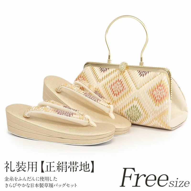 痛くない 歩きやすい、初めての方にも安心の履き心地 振袖 草履バッグセット 成人式 草履バッグセット 振袖用 振り袖 フリー Lサイズ ゴールド ピスタチオ 金 渋緑 茶 華紋 青海波 亀甲 帯地 2枚芯 日本製