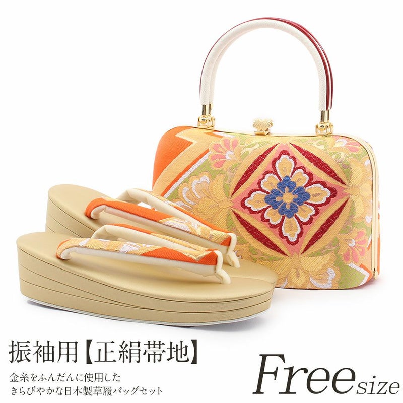 歩きやすい優花緒、初めての方にも安心の履き心地 草履バッグセット 成人式 振袖用 卒業袴 成人用 Sサイズ 金 オレンジ 朱赤 華紋 正絹袋帯地 2枚芯 優花緒 小さい 日本製
