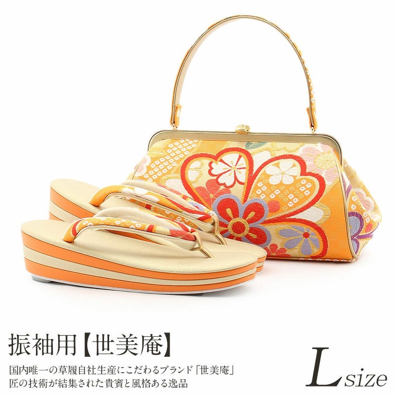 成人式や結婚式の華やかな振袖に合わせたい草履バッグセット。 草履バッグセット 振袖用 世美庵 Lサイズ フリー 黄 赤 金 華紋 桜 鹿の子 吉祥 正絹 3枚芯 優花緒 日本製