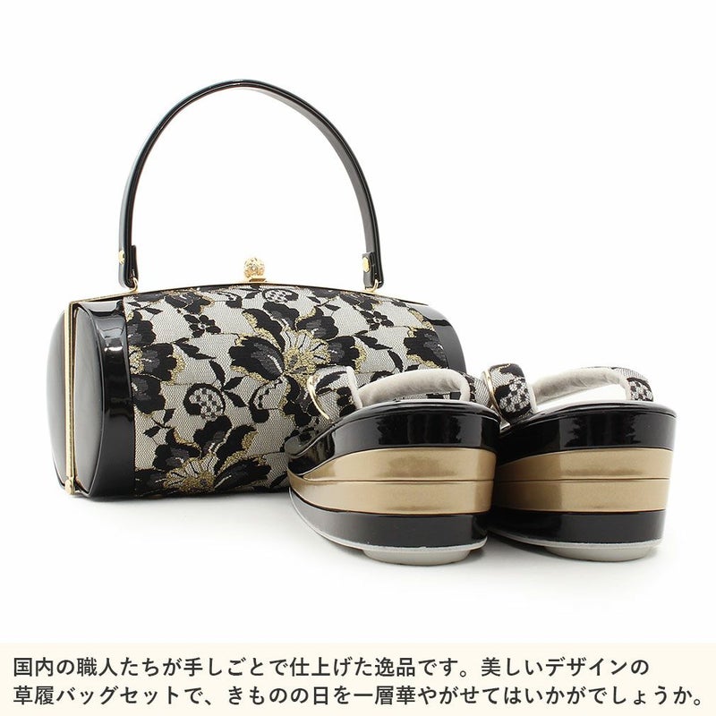 草履バッグセット 振袖用 フリーサイズ Lサイズ 日本製 京都西陣 <ブラック/吉祥花尽くし>