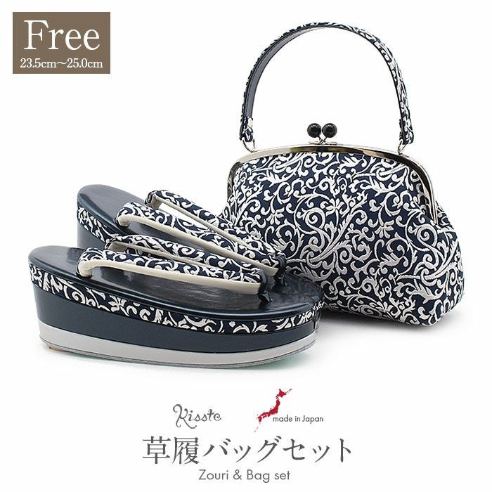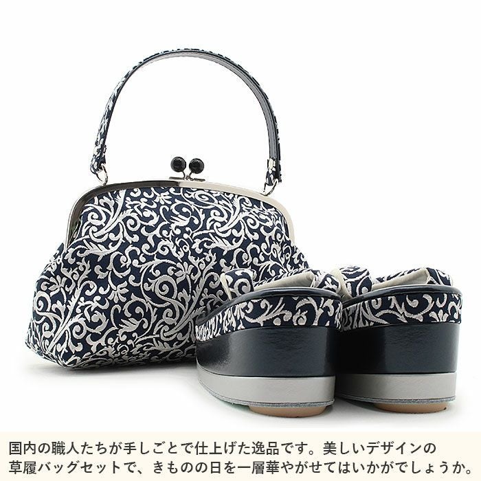 成人式や結婚式の華やかな振袖に合わせたい草履バッグセット。 草履バッグセット 振袖用 フリー Lサイズ 藍色 銀 唐草 正絹 彩小路 3枚芯 ハイヒール 厚底 がま口 日本製