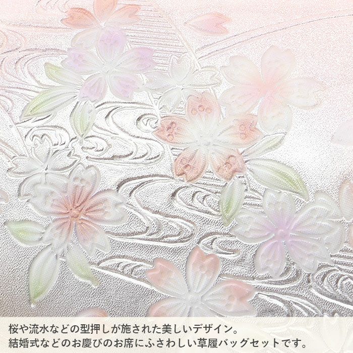 ≪在庫限り≫ 結婚式の黒留袖 色留袖や訪問着に 草履バッグセット 留袖用 訪問着用 草履バッグ フリー L ピンク シルバー ゴールド 桃 銀 金 桜 流水 型押し エナメル 1の2枚芯 日本製