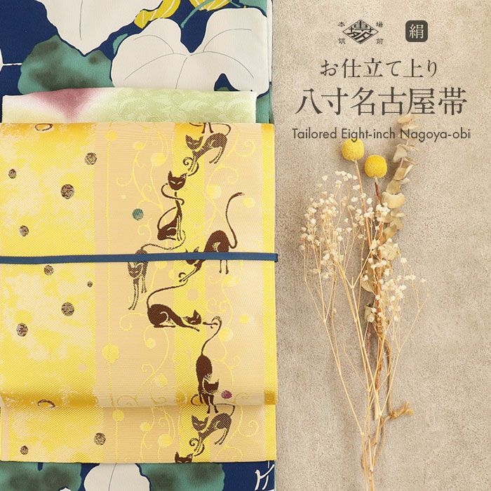 《値下げ!48000円→38000円》【最短日お届け】小紋・紬・色無地・街着などのお着物に 博多帯 筑前帯 博多八寸帯 <お仕立て上がり> 本場筑前博多織 紋八寸名古屋帯 <黄/猫アラベスク>