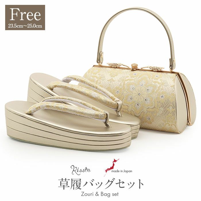 痛くなく歩きやすい、初めての方にも安心の履き心地 成人式 振袖 訪問着 草履バッグセット 草履 バッグ フリー L シャンパンゴールド 金 華紋 スワロフスキー 織生地 3枚芯 日本製