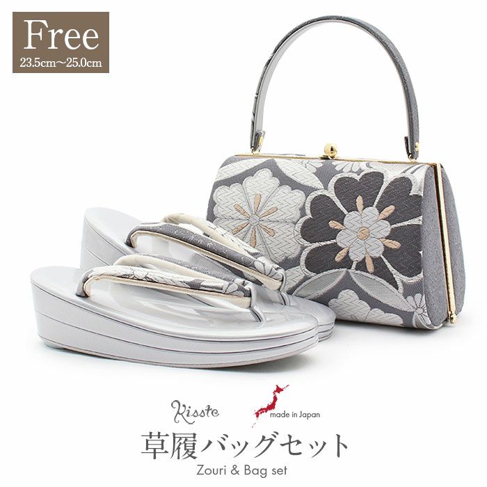痛くなくて歩きやすい、初めての方にも安心の履き心地 振袖 成人式 草履バッグセット 振袖用 振り袖 フリー Lサイズ グレー 灰 金 銀 茶 華紋 七宝 紗綾 帯地 3枚芯 ハイヒール 厚底 日本製