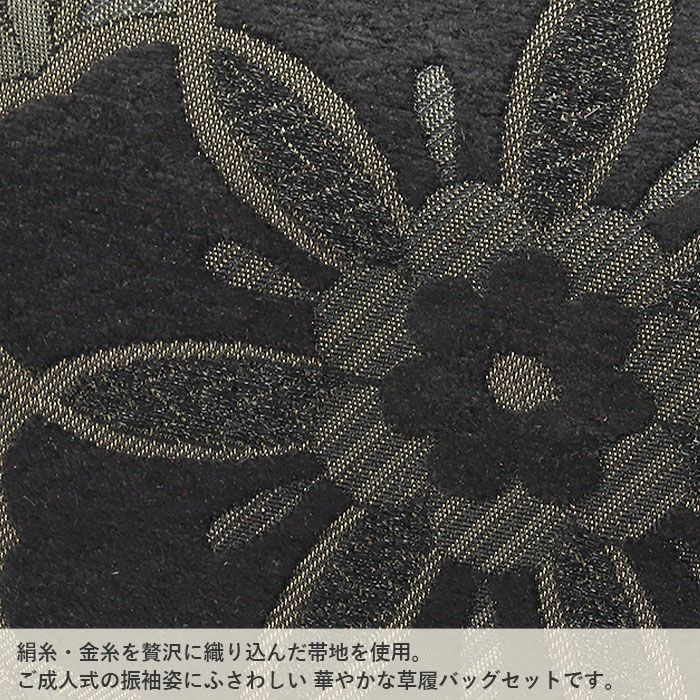 草履バッグセット 成人式 振袖用 <彩小径> Lサイズ フリーサイズ 日本製 袋帯地 <ブラック・ゴールド/花尽くし>