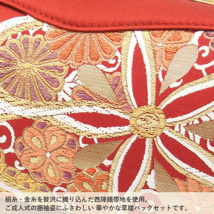 草履バッグセット 成人式 振袖用 フリーサイズ Lサイズ 日本製 帯地 <レッド/紗綾型に菊など> SoNaTa