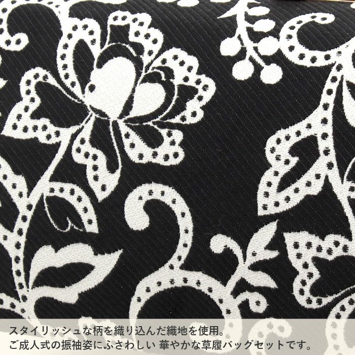 痛くなくて歩きやすい、初めての方にも安心の履き心地 振袖 草履バッグセット 成人式 草履バッグセット 振袖用 フリー Lサイズ ブラック ホワイト 洋唐花 織生地 2枚芯