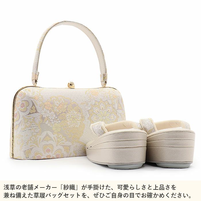 痛くなくて歩きやすい、初めての方にも安心の履き心地 草履バッグセット 留袖用 訪問着用 草履バッグ 紗織 沙織 Sサイズ 小さい シルバー アイボリー ゴールド 花文 七宝 1の3枚芯 日本製