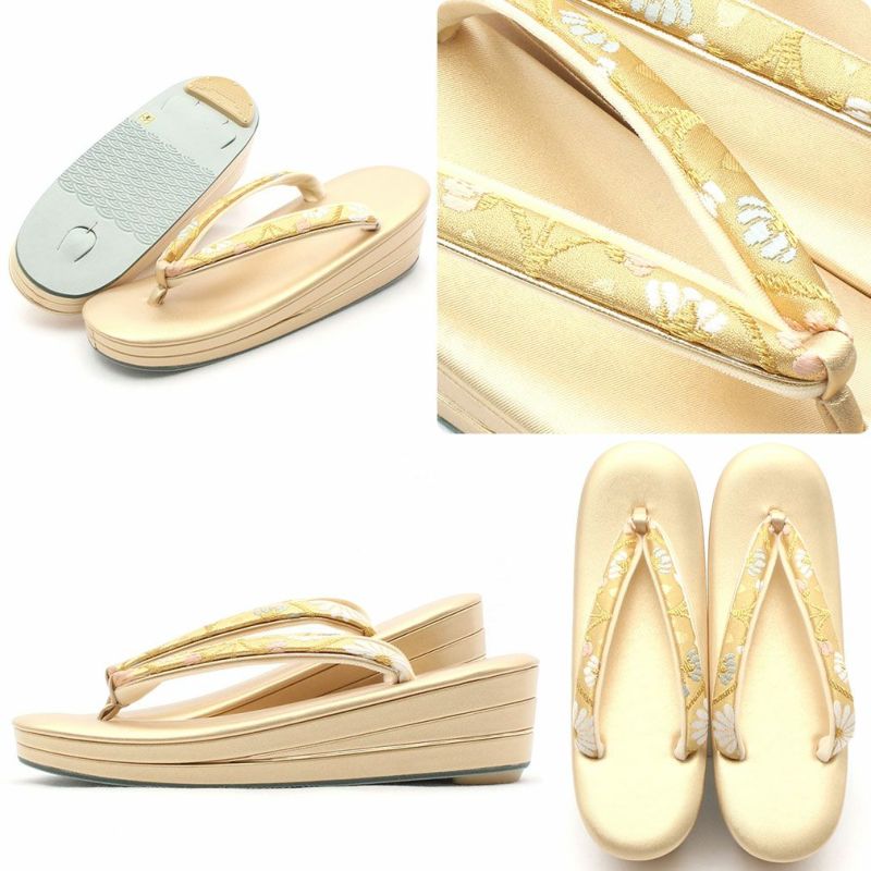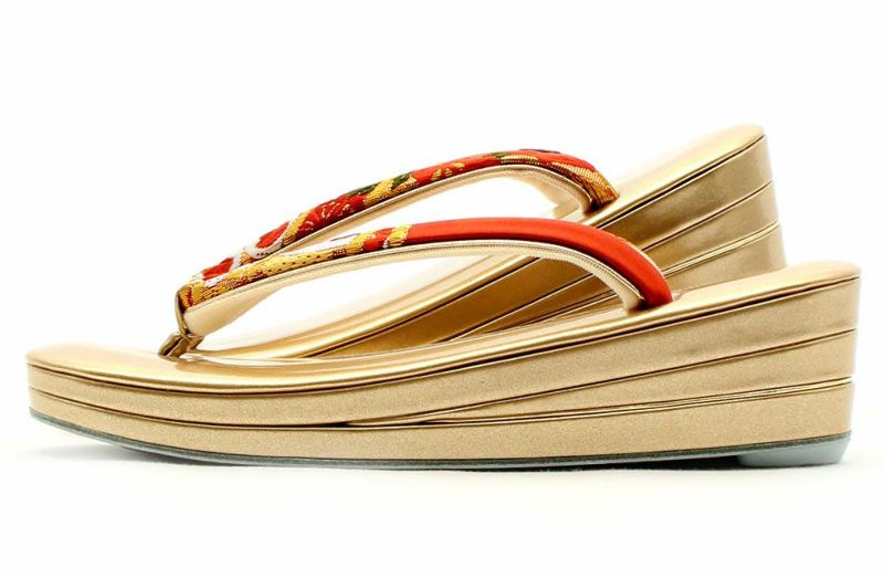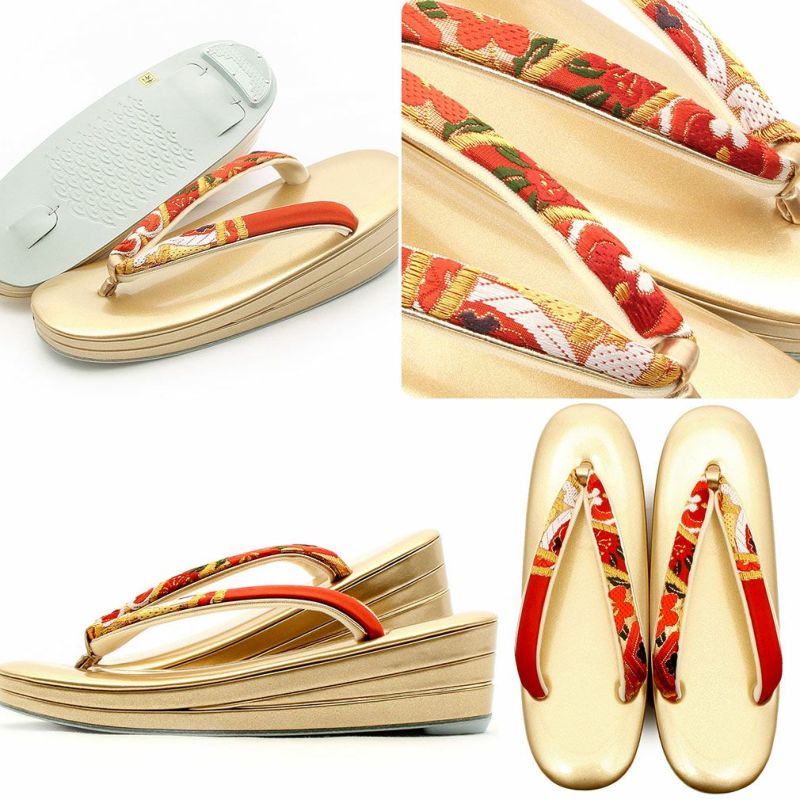 痛くなく歩きやすい、初めての方にも安心の履き心地 草履バッグセット 振袖用 紗織 沙織 Mサイズ Lサイズ 金 ゴールド 西陣織 正絹 帯地 4枚芯 厚底 ハイヒール 日本製