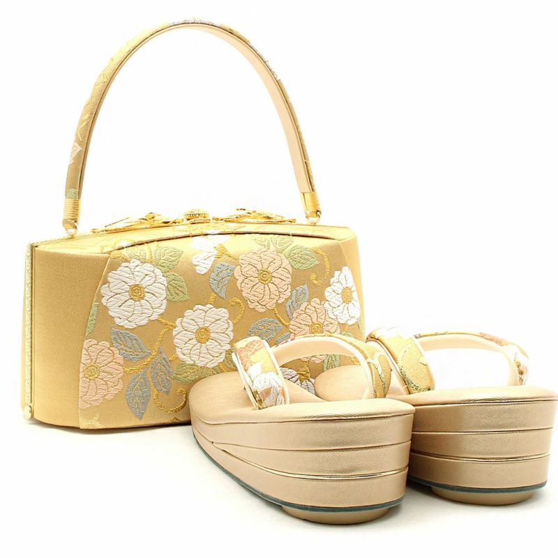 留袖用草履バッグセット 訪問着用 フリーサイズ Lサイズ 日本製 京都西陣 <ゴールド/花唐草>