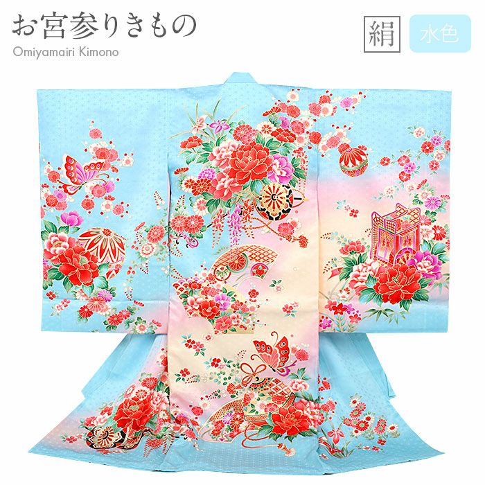 お宮参り 着物 女の子 産着 祝い着 水色 金 赤 桃 白 毬 鞠 椿 亀甲 矢絣 青海波 芍薬 牡丹 正絹 のしめ 掛け着 初着 服装 赤ちゃん 販売 まり マリ 日本製