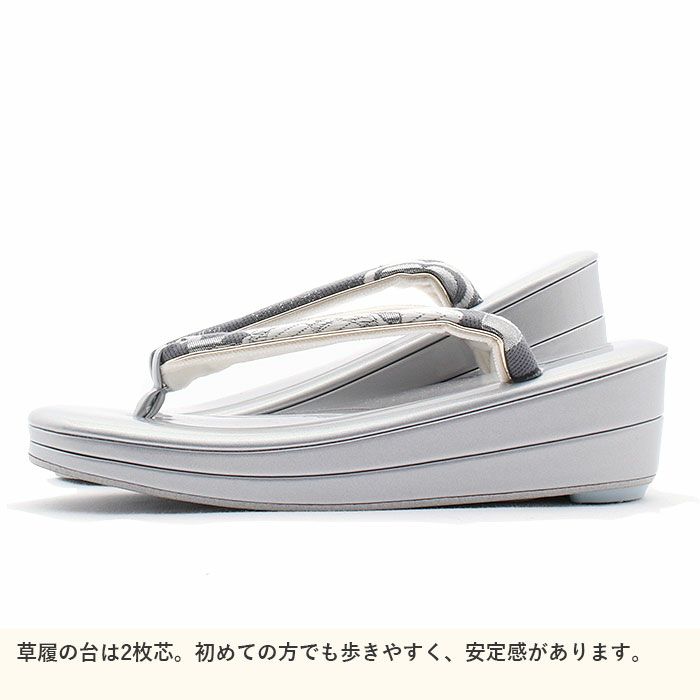 痛くなく歩きやすい、初めての方にも安心の履き心地 草履 成人式 振袖用 成人用 レディース 世美庵 Lサイズ シルバー ブラック 華紋 菱 帯地 合皮 4枚芯 厚底 ハイヒール バイカラー 日本製